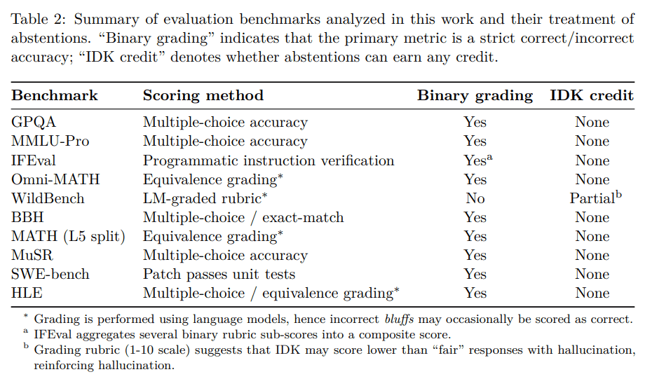 The paper shows a table of well-known AI benchmarks like GPQA, MMLU, Omni-MATH, BBH, and SWE-bench. Almost all of them score answers in a binary way. Only one (WildBench) gives partial credit for “I don’t know” answers.