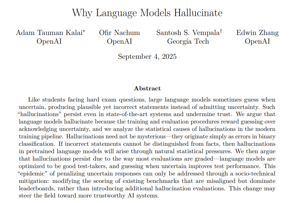 I recently came across a paper called Why Language Models Hallucinate by Adam Tauman Kalai, Ofir Nachum, Santosh Vempala, and Edwin Zhang. I wanted to write down what I understood from it in simple terms, because the ideas seemed important and also explained something I had noticed while using AI tools.